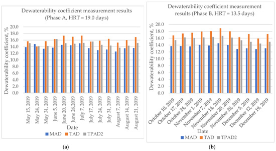 The dewaterability of the digestates from the TAD, MAD and TPAD systems was determined by means of a dewaterability coefficient, which allowed for us to assess the concentration of dry matter in a dewatered digestate sample. Thus, the higher dewaterability coefficient, the better dewatering efficiency (Table 6, Figure 4).
