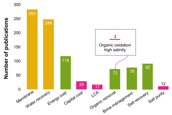 To illustrate the under-representation of these important topics to the state-of-knowledge, we carried out an unofficial Web of Science Core Collection search of the literature on “Zero Liquid Discharge”, from 2000 to 2021 (Figure 2). Among the 914 published articles retrieved from the database, a vast majority of research in this area has focused on “Water recovery”, “Membranes” and “Energy cost”, and there is emerging interest on “Organic removal”, “Brine management” and “Salt recovery”. As aforementioned, research on these topics has promoted our mechanistic and system-level knowledge to develop smart and efficient ZLD processes. According to the authors, continuous studies would be devoted to improving the energy efficiency of the membrane and thermal systems. For example, novel membrane materials (e.g., omniphobic and Janus membranes [34]) and desalination processes (e.g., solar membrane distillation [35] and capacitive deionization [36]) have been recently suggested as new paradigms for ZLD.
