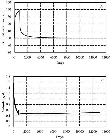 The simulation at the given rate of recharge results in a groundwater head increase by a maximum of 36.96 m at the end of 27 months (823 days). Similarly, the concentration of salinity is reduced to 0.44 gL−1 from the ambient groundwater salinity of 1.5 gL−1 (Figure 6).