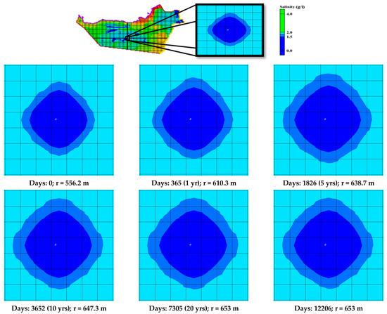 The elevated groundwater head lasts up to a period of 6642 days (July 2033) that reaches the groundwater head at the initial stage. In the case of groundwater salinity, the increase in the concentration after the recharge cutoff is not prominent. The maximum increase in the concentration of salinity is in second order (0.08 gL−1) up to the end of the year 2050. During the period of storage, the radial spreading of the freshwater lens is observed from the initial radial distance (r) of 556.2 m to 610.3 m, 621.7 m, 630.2 m, 638.7 m, 647.3 m, 650.1 m, and 653 m at the maximum during 0, 1, 5, 10, 20 and 33 years of storage (Figure 7). The observed spreading of the freshwater lens is varying from 54.1 m per annum during the first year of storage to 0.58 m per annum after fifteen years of storage. The spreading has become absent after twenty years of storage when it reaches the radial distance (r) of 653 m from the recharge pond. It is the same lasting period of elevated groundwater head. The thickness of the transition zone is increasing when the duration of storage increases. The transition zone with the salinity concentration of 1.8 gL−1 is increased from 152.6 m to 220.9 m at the maximum.