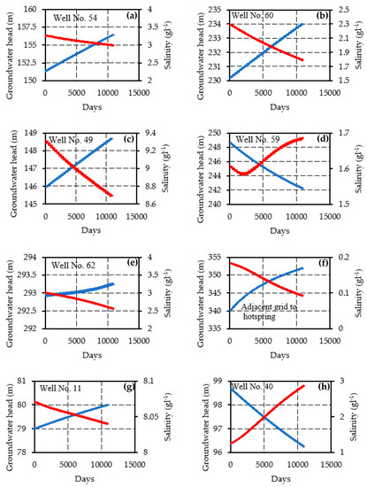 Predicted change in groundwater head and concentration of salinity from the year 2021 to 2050 using the current rate of groundwater pumping and irrigation return flow in correspondence of: (a) Well No. 54; (b) Well No. 60; (c) Well No. 49; (d) Well No. 59; (e) Well No. 62; (f) Adjacent grid to hotspring; (g) Wll No. 11; (h)Well No. 40.