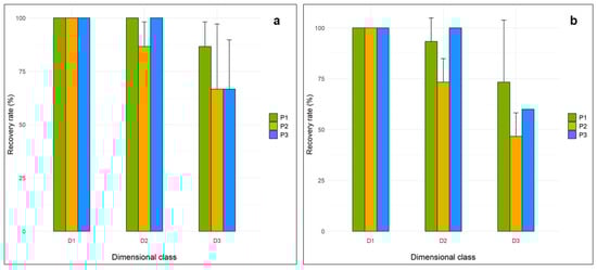 Percentage recovery rate of (a) Nylon and (b) PET particles for the three protocols testes (P1, P2, P3) grouped by the different dimensional classes (D1: 2–5 mm; D2: 500–2000 µm; D3: 500–250 µm).
