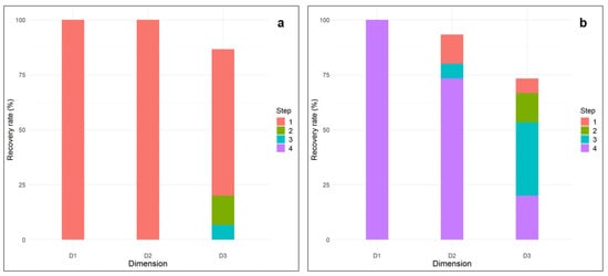 Average percentage recovery rate for the sequential steps (1–3: density separation with NaCl, 4: density separation with NaI) of Protocol number 1 for the different dimensional classes (D1, D2, D3) for (a) Nylon particles and (b) PET particles.