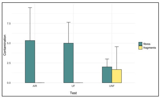 Figure 3 reports the number of contaminating particles detected for the different tests performed, divided between fibers and fragments. Fibers were detected in all the procedures performed, with the highest value in the ‘AIR’ sample. High values were also detected for the filtered samples of ultrapure water (‘UNF’). Instead, fragments were less abundant, and no fragments were detected in the ‘AIR’ samples and in the ultrapure water filtered (‘UF’). In general, the water filtration step proves to allow removing the contamination with fragments but leads to major contamination with airborne fibers.