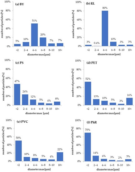Size distribution of nano and small microparticles in the tested suspensions: (a) BY; (b) RL; (c) PS; (d) PET; (e) PVC; (f) PhR.