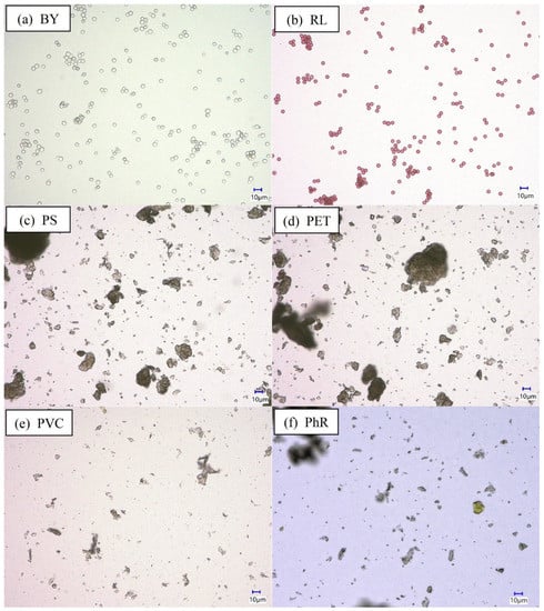 Microphotographs of the used microparticles: (a) BY; (b) RL; (c) PS; (d) PET; (e) PVC; (f) PhR.