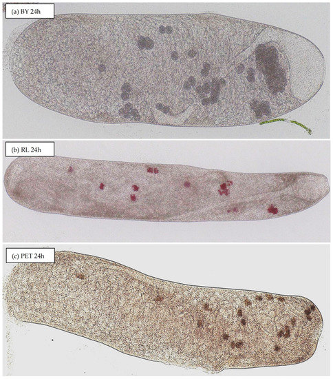 After 24 h, it was observed that the number of vacuoles in the most concentrated BY suspension was doubled. The vacuoles were also larger and contained several dozen yeast cells (Figure 3a). Similarly, in the two most concentrated PET, PVC, and PhR suspensions, the number of vacuoles was increased significantly compared to that observed after 2 h. By contrast, in the samples containing 103 and 104 particles mL−1, no or only single vacuoles were observed even after 24 h.