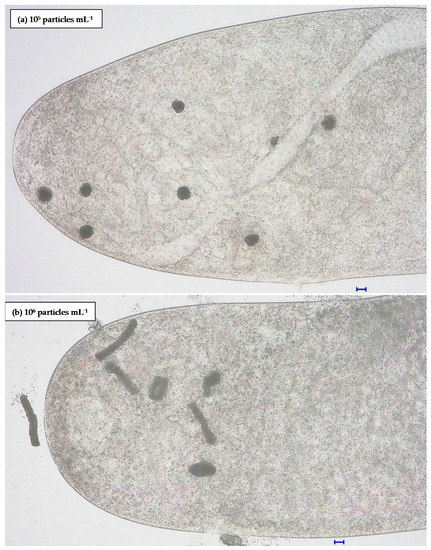 Railkin [20] investigated food intake by protozoans depending on the proportion of edible (yeast) to inedible particles (coal). As observed in the present study, the author found that both S. ambiguum and P. caudatum could not distinguish between edible and inedible particles. He also reported that depending on the type of inedible ingredient present in the mixture, the rate of food vacuole formation differed, although all the tested ingredients were nontoxic. Dürichen et al. [26] observed that T. pyriformis did not show any food preferences and took up both bacteria and non-nutritive microspheres to the same extent. Albano et al. [37] found that the presence of PS microbeads significantly reduced microalgal ingestion by A. salina, which consequently led to a reduction in the body length and a developmental delay.