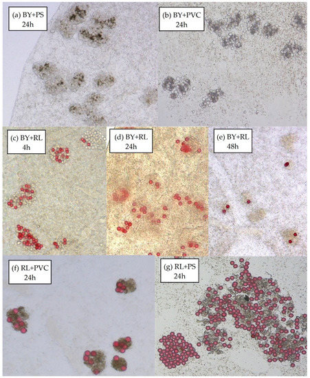 Food vacuoles with the mixture of particles: (a) BY + PS after 24 h; (b) BY + PVC after 24 h; (c) BY + RL after 4 h; (d) BY + RL after 24 h; (e) BY + RL after 48 h; (f) RL + PS after 24 h; (g) RL + PVC after 24 h.