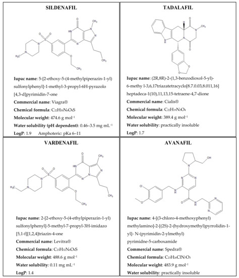According to the “anatomical therapeutic and chemical” (ATC) classification system, PDE-5 inhibitors are available in the class ATC code G04BE. The four most significant inhibitors used are sildenafil (Viagra®), tadalafil (Cialis®), vardenafil (Levitra®) and avanafil (Spedra®), all approved by Food and Drug Administration (FDA). In addition, there are other pharmaceuticals that are non-FDA approved and commercially available in some countries, such as udenafil (Zydena®) in South Korea and Malaysia, mirodenafil (Mvix®) in South Korea and lodenafil carbonate (Helleva®) in Brazil [28].