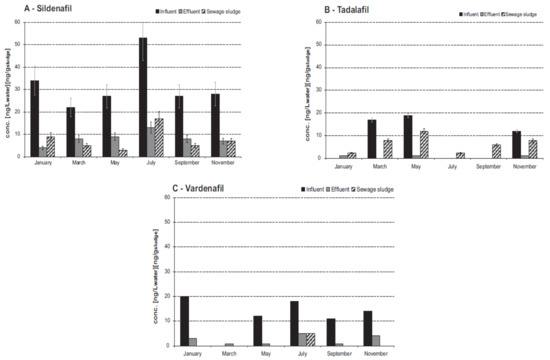 Amounts of sildenafil, tadalafil and vardenafil in influent and effluent wastewater and sludge samples collected from the STP Tarragona (Spain) [15]. Reprinted with permission from ref. [15]. Copyright 2021 Elsevier.