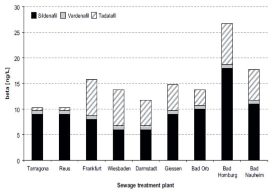 Studies conducted in several German STPs revealed that: (i) sildenafil was constantly in greater quantity (except in the case of Wiesbaden, where tadalafil was the most copious); (ii) sildenafil was detected in 100% of samples at concentrations ranging 6 to 18 ng L−1. The highest level of 18 ng L−1 was determined in the STP effluent from Bad Homburg, while the lowest amount of 6 ng L−1 remained in samples from Darmstadt. In general, there were no significant differences in sildenafil levels found in Spanish and German samples (Figure 3).