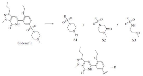 Temussi et al. [47] report remarkable results: drug chlorination experiments were performed on sildenafil and tadalafil, simulating conditions of a characteristic wastewater management procedure. The main transformation compounds were isolated and fully characterised. Sildenafil showed a high reactivity by hypochlorite addition and was completely mineralised in 1h. The reaction mixtures were treated with thiosulfate to remove the hypochlorite excess and then extracted with ethyl acetate. No appreciable variations were detected in the experiments, and three main by-products were isolated by chromatographic separation and identified by spectroscopic analyses (S1–S3) (Figure 4).