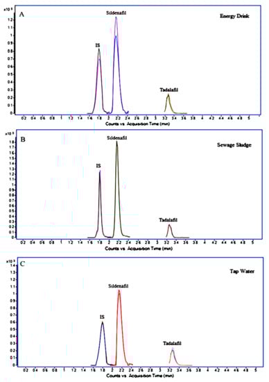 Öztürk Er et al. [100] validated a sensitive method for determining sildenafil and tadalafil using LC-QTOF-MS/MS and optimised both LC and MS parameters. They obtained very low LOD/LOQ values of 0.16/0.53 and 0.28/0.93 ng g−1 for sildenafil and tadalafil, respectively. They successfully applied this method to analyse the two drugs by spiking experiments into all tested matrices into energy drinks, sewage sludge and tap water (Figure 8).