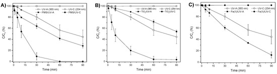 According to [45], the dissociation capacity of PMS in the presence of UV radiation ranged from 248 nm to 351 nm, and decreased as the wavelength increased, so the ability to generate sulfate radicals by PMS is conditioned by the type of UV radiation used. This fact can be clearly observed in Figure 1A, where the discoloration yields of MB combined with 500 mg/L of PMS were 59% and 100% after 60 min of exposure to UV-A and UV-C radiation, respectively. Although PMS requires prior activation to generate free radicals, its remarkable oxidation potential allows, even in the absence of radiation, the MB to be slightly reduced, namely by 6.5% in 120 min [30]. The removal performance caused by the activation of the PMS is higher under both UV spectra regarding the treatments that did not contain the reagent. Furthermore, it is observed how UV-C radiation removes MB by itself, without using PMS. Figure 1 shows that UV-A radiation alone does not reduce the concentration of methylene blue, which differs from the results found by Andrade et al. [46]. This discrepancy may be explained by the operating conditions used in this study, especially the irradiance. Irradiance will be affected by the radiation power of the lamp used, the position of the lamp with the water sample, and the type of reactor that would affect the radiation distribution in the sample.