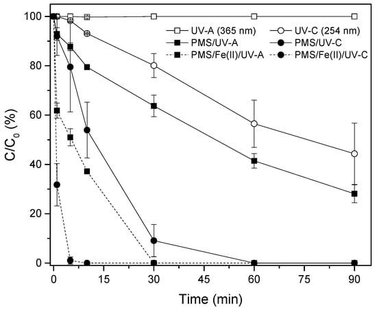 Figure 2 shows the removal rates for the experiment using UV-A and UV-C radiation with PMS and Fe2+. As can be observed, the use of Fe2+ to activate PMS increased the discoloration performance of MB compared with treatments without catalyst, as a consequence of the increase in the kinetics of sulfate radical generation [19,20,21,23,24]. Exposure to UV-C radiation increased the discoloration rate by 50% compared with the values obtained by UV-A, reducing the time required to achieve the total removal of MB at around 5 min.