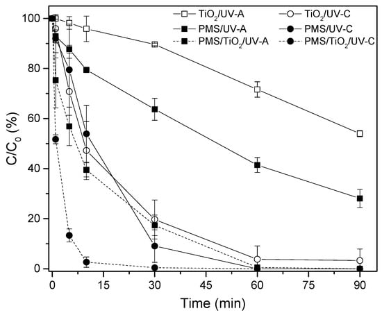 The photocatalysis of TiO2 increased as the wavelength decreased from UV-A to UV-C, approximately 280 nm. Therefore, the absorption of photons and the subsequent release of electrons for the activation of PMS are possible routes of MB degradation, generating sulfate radicals, hydroxyl radicals, and anions with oxidative power. Nevertheless, other routes of degradation should be considered, such as holes in the valence band, which could produce hydroxyl radicals in contact with water [31,33].
