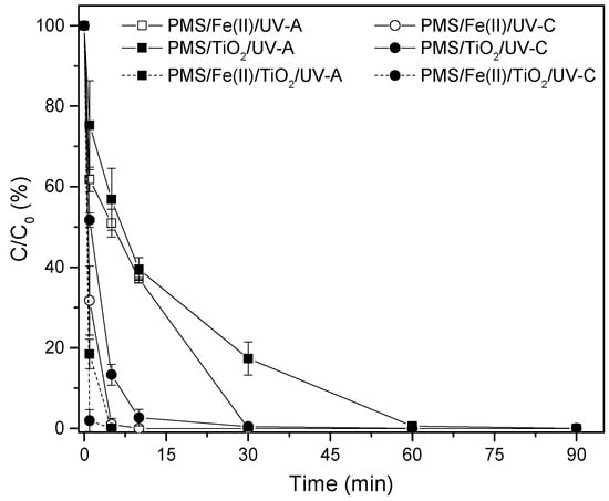 Normally, iron activation is commonly used in conjunction with UV radiation in order to promote a quick photoreduction of Fe3+ generated in Fe2+ to continue catalyzing the generation of free radicals by PMS decomposition. Additionally, TiO2 is one of the most reported photocatalysts [34]. For that reason, the study of the influence variables in the activation of PMS by Fe2+ and TiO2 were carried out in the presence of UV-C and UV-A radiation.