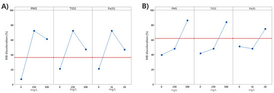 Figure 5 plots the main effects for the three variables (PMS, TiO2, and Fe2+) on the response factor, the MB discoloration, in combination with UV-A (Figure 5A) and UV-C radiation (Figure 5B), after 10 min of reaction. It is clearly observed that these three variables have a main effect on the discoloration of MB, being higher with UV-C radiation, as previously shown in the discoloration kinetic plots. In the case of UV-A driven assays, the maximum effect is obtained with the central concentration point of the three variables, decreasing the effect with a higher concentration (Figure 5A). When using UV-C radiation, it can be observed that there are no significant differences in MB discoloration in terms of the main effect of the individual variables, obtaining similar yields with PMS or TiO2, the effect using Fe2+ being slightly lower. The main effect is the average effect of every experiment containing one factor and its combinations, so that the main effects of Fe2+ similarities to the main effects of other factors can be explained by the catalysis that this compound exerts on PMS, but also by the effect caused by UV-C radiations by itself. The p-value of Fe2+ obtained when using exclusively Fe2+ exposed to both spectra (Table S1, Supplementary Material) shows that there is blue discoloration of MB occurring, also likely due to oxidation of ferric compounds in the water that could lead to the production of hydroxyl radicals when using UV radiation.