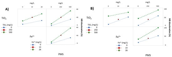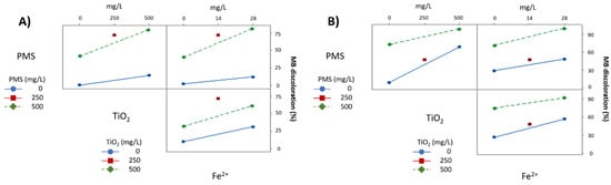 Figure 6 shows the interaction between variables under UV-A and UV-C radiation (Figure 6A,B, respectively). Under UV-A radiation (Figure 6A), PMS interacts strongly with TiO2 and Fe2+; however, there are no interactions between TiO2 and Fe2+ as the plotted lines are almost parallel. The interactions under UV-C are quite different (Figure 6B). Again, there is an interaction between PMS and TiO2, and it can be considered a negative interaction because of the tendency of the lines to cross at some point. This negative interaction can be confirmed by numerical regression, where the standardized value of the effect is -0.16, meaning that high performance in discoloring MB is achieved by the addition effects of PMS by its own, plus the additive effect of TiO2 by its own, and the effect exerted by UV-C, but also that the interaction of the three factors can reduce this additive effect of the three factors. Furthermore, there is a slight interaction between TiO2 and Fe2+ and PMS and Fe2+, but the lines are almost parallel and further statistical analysis is required to confirm the interactions and their significance. In the particular case of the PMS and Fe2+ interaction when subjected to UV-C radiation, a complete degradation of MB was achieved before 10 min, so the interaction plots are underestimated when compared with the effect exerted by PMS on its own. Therefore, interaction plots at 5 min of the experiment were also obtained (Figure 7), showing that the interaction is higher than those experiments at 10 min, but slightly less than the UV-A radiation experiments.