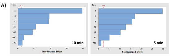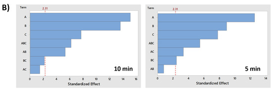 Pareto chart of standardized effects (α = 0.05) for MB discoloration after 10 and 5 min under (A) UV-A radiation; (B) UV-C radiation. Factor names: A = PMS; B = TiO2; C = Fe2+.