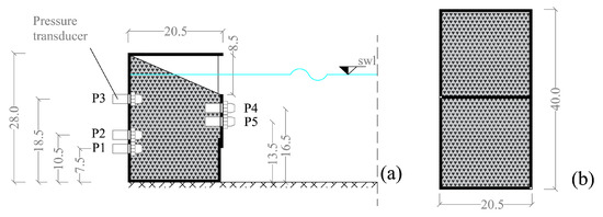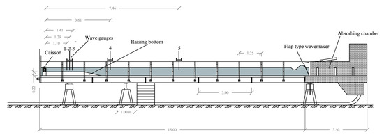 At the end of the channel, opposite to the wave-maker, a scaled model of a combined caisson with a 1:40 geometrical scale ratio is located (see Figure 3). The caisson model has dimensions 40 cm × 20.5 cm × 28 cm and is made of steel. Inside there is a separation wall that creates a double chamber in the cross section.