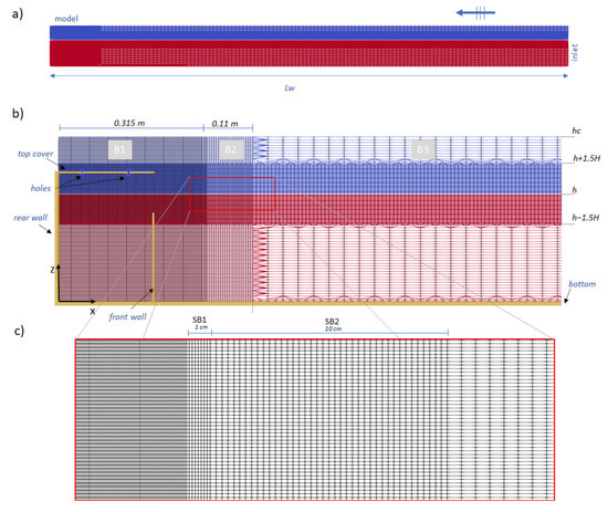 Computational domain used for the numerical simulation of the composite caisson: (a) cross section of the entire domain; (b) detail of the grid close to the model; (c) detail of the grid in the transition zone. The symbols indicate , , and the name of the three blocks; and the name of the two sub-blocks; the height of the numerical flume; h the mean water level; and H the height of the incident regular waves.