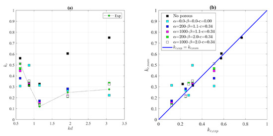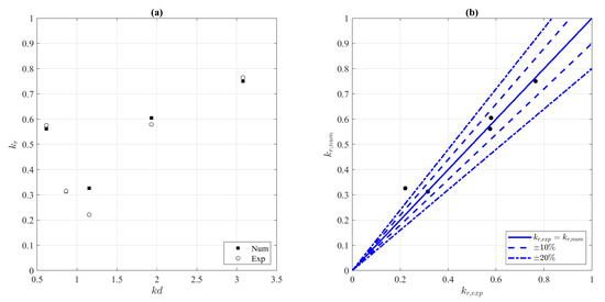 Comparison between the reflection coefficient estimated from the experimental data and that estimated from the numerical model: (a) reflection coefficient as a of function ; (b) experimental data vs. numerical data.