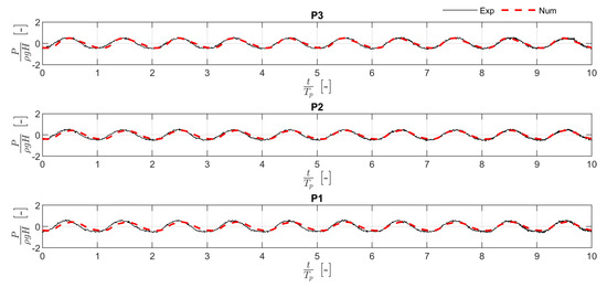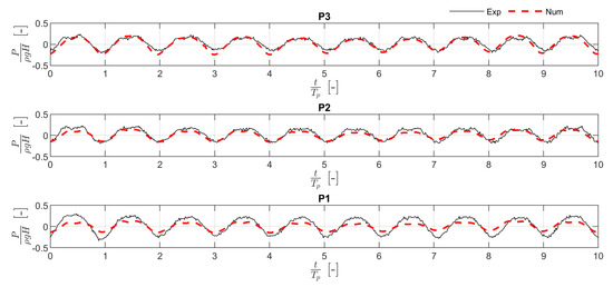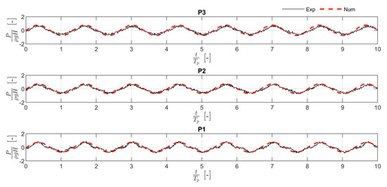 Comparison between the pressure measured in the experimental campaign by the three transducers located on the rear wall and that estimated by the numerical model. The data refer to a wave with = 0.86.