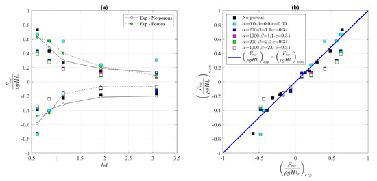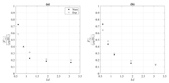 Figure 11 shows a comparison of the wave loading at the front wall estimated by the numerical model and those observed in the laboratory tests. The comparison between the experimental and the numerical data was extended to the wave loading at the front wall under both the wave crests () and troughs ().