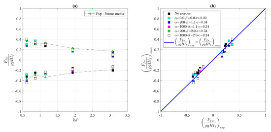 Comparison between the wave loading at the rear wall estimated from the experimental data and that estimated from the numerical model: (a) as a function of ; (b) vs. .