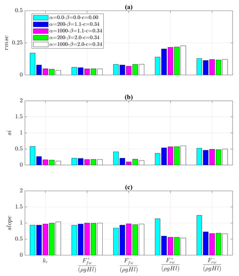 The calibration of the closure terms in the VARANS equations (linear, nonlinear, and transient components) was carried out considering several values of and (see Equations (2) and (3)). Following previous studies, c was set equal to 0.34 [10,14,20].