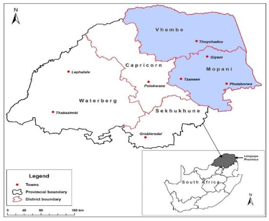 The study focused on the Mopani and Vhembe districts in the Limpopo Province, South Africa (Figure 1). The two districts are identified as climate change hotspots in Limpopo Province [20]. The Mopani district municipality is comprised of five local municipalities, namely, Greater Tzaneen, Greater Giyani, Letaba, Maruleng, and Ba-Phalaborwa. The district covers a total land area of approximately 1.4 million hectares, with a total population of 1.2 million people [21]. The district is characterised by low rainfall especially in the lower areas of Giyani and Ba-Phalaborwa municipalities. The Mopani district experiences average maximum temperatures of 21 °C to 37 °C in January, average minimum temperatures of 5 °C to 12 °C in July and has annual average temperatures of between 13 °C to 27 °C [20]. A large portion of the district, the eastward side of the Drakensberg escarpment, receives an annual average rainfall of about 400–500 mm, while the area at the foot and on the escarpment receives 600–800 mm and 800–1000 mm, respectively [20]. Agriculture is one of the key economic sectors, which are predominant in the Tzaneen, Letaba, and Maruleng.