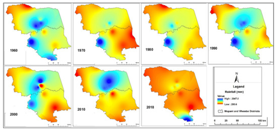An analysis of past rainfall trends facilitates an understanding and forecasting of possible future changes, and provides informed and reliable pathways towards adaptation and resilience. Past trends in rainfall, as well as changes in oceanic temperatures, provide important indications about the intensity and frequency of possible future extreme weather events and climate variations [22]. This study analysed observed climatic data for a period covering 58 years (from 1960 to 2018). This facilitated an understanding of the patterns and trends in the climatic variable in the study areas. The process provided the basis for projection of future rainfall changes and patterns. Recorded rainfall data from a total of 16 stations in the districts were used to calculate the average annual rainfall, maximum and minimum temperatures of both districts. The assessed climatic variables were also used to create continuous rainfall and temperature surface maps for the period under consideration through interpolation. The interpolation facilitated the comprehension of the spatio-temporal changes and variations taking place in the study areas. The process facilitated the development of contextualised adaptive measures in each of the study areas. The inverse distance weighting (IDW) interpolation method was used to create the continuous surface heat maps in Geographic Information System (GIS). The IDW interpolation is a widely used method in spatial rainfall distribution studies [23,24,25,26].