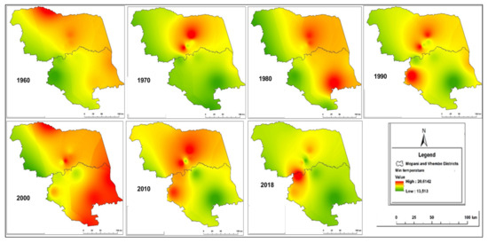 Minimum temperature for 1960, 1970, 1980, 1990, 2000, 2010, and 2018 in the Mopani and Vhembe Districts.