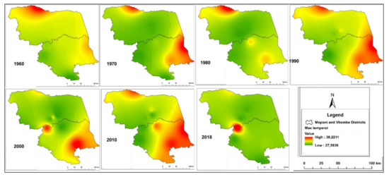 Maximum temperature for 1960, 1970, 1980, 1990, 2000, 2010, and 2018 in the Mopani and Vhembe Districts.