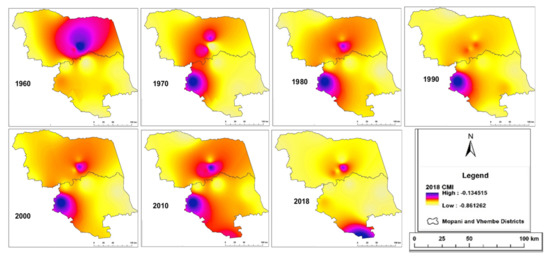 Climatic Moisture Content (CMI) for 1960, 1970, 1980, 1990, 2000, 2010, and 2018 in the Mopani and Vhembe.