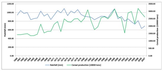 The variations in moisture in the study area adversely causing reduced crop productivity due to worsening aridity (Figure 7). Rainfed agriculture, coupled with other factors such as poor infrastructure and lack of resources to adapt to the changing environment, are only compounding the vulnerability of the two districts under study. These changes are projected to result in a reduction of between 2% and 7% in agricultural GDP by 2100 [2,14]. Although rainfall has been mainly highly variable from 1960 to 1978, it started to decline since then and to date. Although cereal production has been increasing steadily over the years, it has always failed to meet the demands of a growing population [2]. The lows in cereal production coincide with seasons of droughts.