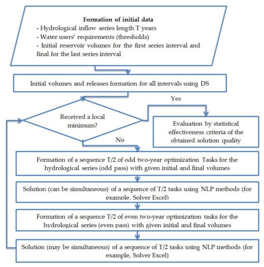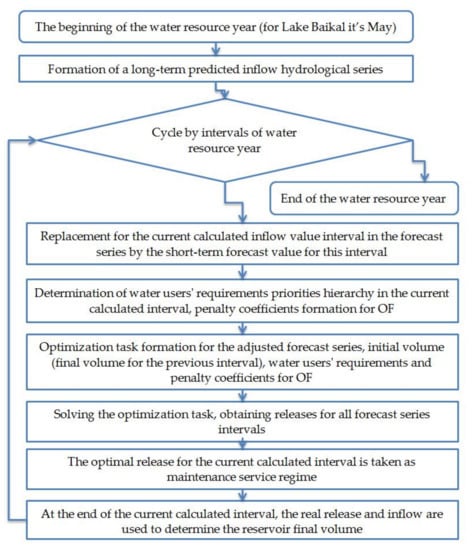 The strict meaningful formulation of the problem is as follows: to create a computational technique that would make it possible to manage the reservoir water resources on-line, based on optimization methods without using DS. That is, form releases to the reservoir downstream for the next time interval (usually 10–30 days) depending on the reservoir volume (level) at the interval beginning; the short-term and long-term hydrological inflow forecast for this interval; the long-term observed inflow series for the previous years; and the actual water users’ requirement priorities hierarchy for this period. The time interval duration depends on the hydrological situation during this period: summer-autumn or winter low-water period, spring or rain floods.