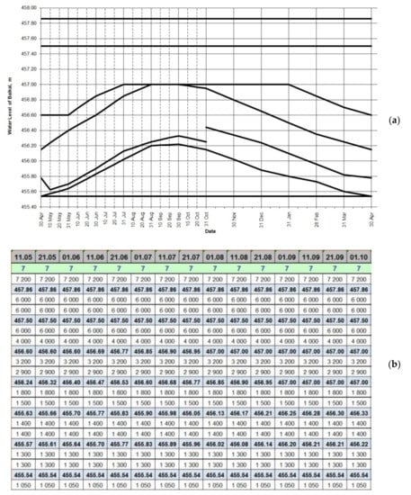The permissible reliability range for each water use type is specified by regulatory documents []. The DS design process finishes if the reliability falls within the normative ranges. If this fails, then a compromise DS is built. Figure 2 shows the approval for the “Lake Baikal–Irkutsk Reservoir” DS 1988 [] in graphical and tabular form, with a given releases range for each zone, depending on the levels and time interval.