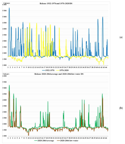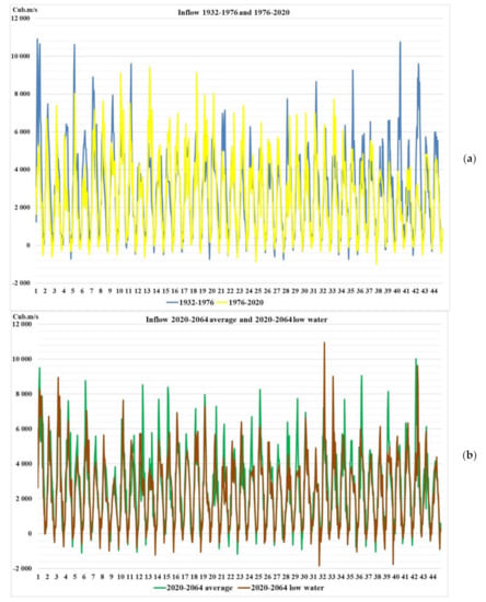 Article [] describes a developed systematic procedure Tai WAP to quantify changes in water resources and improvements after implementing adaption measures. Assessing water resources vulnerability and resilience are performed using an integrated tool, including climate change scenarios, a weather generator, a hydrological model and system dynamic models (unfortunately, the release rules used in the procedure are not given). Since the generators of the climate change scenarios formation indicated in [] poorly predict the future hydrological situation, especially for regions where the inflow depends on precipitation, snow cover and glaciers melting, the study decided to make a forecast for the historical inflows’ series from 1903 to 2020, dividing it into two parts: average water content (1903–1994) and low water content (1995–2020). For these two scenarios, a 44-year hydrological forecast was carried out.