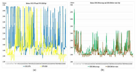 Unfortunately, in [], the calculations were carried out for one characteristic year for three water content options: wet, normal, dry. This did not allow us to assess the system reliability over a long-term period of operation, during which the characteristic periods (wet, normal, dry) can last for several years (4–6). In addition, the calculation results were assessed by the value of the OF, in which different components (power generation, ecology, water supply and shipping) are poorly comparable in importance (benefit). Therefore, in the studies adduced, hydrological series of sufficient duration (44 years) were used. This made it possible to assess the reliability of the WRS by statistical criteria (reliability, resilience, vulnerability), which have clear economic and physical meaning. Furthermore, in contrast to [], a comparative assessment of optimization and traditional management methods was made. Although the application of the NSGA-III multi-criteria optimization algorithm used in [] is of certain interest.
