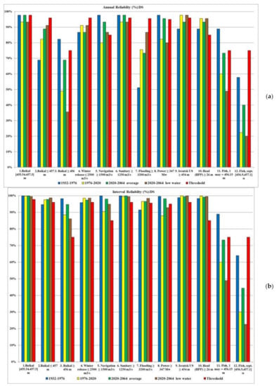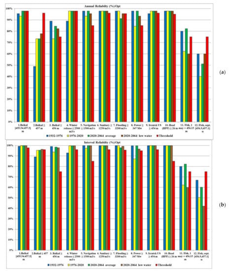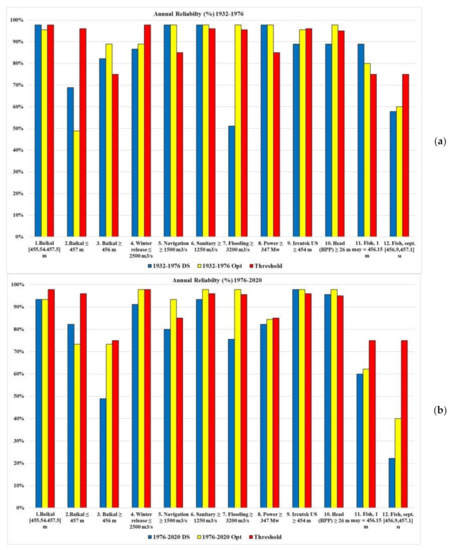 Figure 17a (series 1932–1976) shows that reliability under optimization increases for criteria 3, 4, 7, 9, 10, decreases for criterion 2 and practically does not deteriorate for all other criteria. Since the DS 1988 is tuned to the 1932–1976 series, there is no significant improvement in reliability. However, for the low-water series 1976–2020 (Figure 17b), in almost all criteria, there is a significant improvement in the reliability indicator due to the poor performance of the DS for this period.