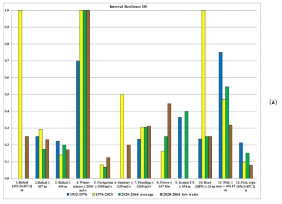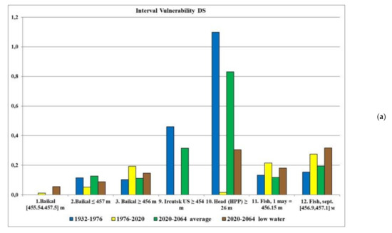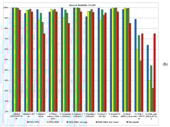 The second important factor that affects the reliability of DS management is the change over time in the water user requirement priorities (see Section 2.3.1). This too cannot be taken into account when constructing the DS. Calculations have shown that the management using the DS 1988 in the “Lake Baikal–Irkutsk Reservoir” has worse reliability indicators for the 1976–2020 inflow series than for the 1932–1976 series on the basis of the series and the requirements during the period in which it was built, not only because the climate has changed, but also because of the changed priorities.