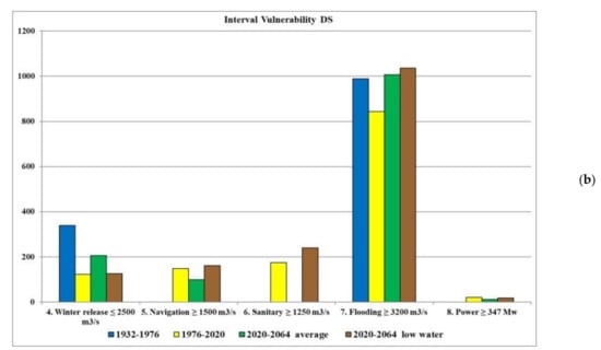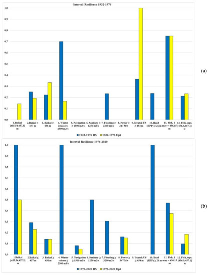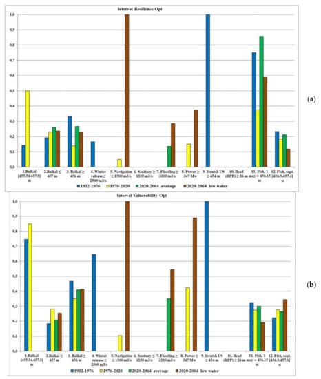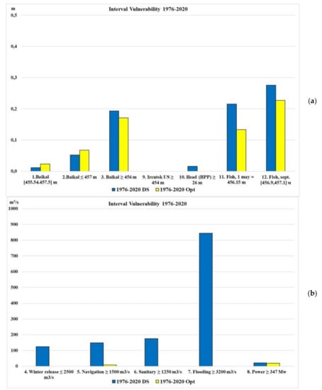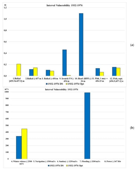 The use of the squared deviation from the threshold in the objective function during optimization, as a rule, leads to an increase in violations (failure), but decreases their amplitude (the maximum deviation value decreases). In this case, as a rule, there are many successive intervals with small deviations. In the years of average water content (1932–1976) it is possible to reduce by optimization such small deviations to zero, that is, to reduce the number of criteria with violations (Figure 18a). However, in dry years (1976–2020), the number of consecutive intervals with failure (resilience) increases. This is clearly seen in Figure 18b.