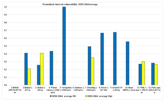 Table 3 shows that DS works best for time series 1932–1976, and worse for all other series. The results of optimization calculations are all much better than calculations for DS, and INVI for the time series 2020–2064 average is generally extremely low. The fraction of the cumulative average failure depth is 0.11. Figure 22 shows the calculation result comparison (normalized vulnerability) for the series 2020–2064 average for DS and optimization methods. The management quality by optimization methods is obvious.