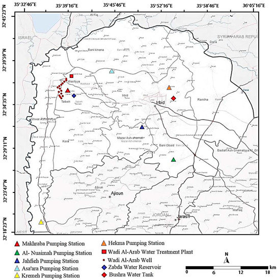 Irbid is a Jordanian city that is located in the north of the country. It has the second largest population in Jordan after the capital city Amman, and it has the highest population density in Jordan. Irbid is the nearest governorate to Syria borders, which is considered a war zone. Groundwater wells from Wadi Al Arab well fields are the current major sources of potable water for the city of Irbid. As mentioned earlier, Irbid has 73 water pumping stations and 52 water reservoirs, but in this study, the focus is only on 6 pumping stations and 3 water reservoirs, including Wadi Al-Arab wellfield, and 1 water treatment plant [39,40]. Figure 1 shows the location of each water asset and Appendix B presents the observations that were obtained upon site visits to each asset.