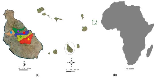 Santiago Island is in the southern part of the Cape Verde archipelago, between the parallels 15°20′ and 14°50′ of north latitude and the meridians 23°50′ and 23°20′ of west longitude (Figure 1b). It is the largest of the ten inhabited Cape Verde islands, with an area of 991 km2, corresponding to about 25% of the total archipelago area. Santiago Island is elongated in the NNW-SSE direction and presents rugged relief with wide and open valleys. The highest point is Pico de Antónia at 1394 m a.s.l., located in the south-central part of the island. The northern two-thirds of the island is cut by deep valleys, but in certain places (i.e., west of the city of Assomada and the center of the island) there are sloping paleotopographies that can be recognized as comprising large non-conformities covered by younger lavas [50]. Regarding data from [47], the island has an estimated population of 309,372 inhabitants, administratively distributed in nine Municipalities (Tarrafal, Santa Catarina, Santa Cruz, Praia, S. Domingos, S. Miguel, S. Salvador do Mundo, S. Lourenço dos Órgãos, and Ribeira Grande de Santiago). The rainfall follows the characteristic archipelago seasonality (an annual mean of around 300 mm), with the wet period between August and October. According to [51], the relief and far southern location of the island contribute to greater precipitation compared to other islands, and the steep slope mainly leads the superficial water flows towards the sea. Regarding vegetation (ranging from cactus at low altitudes to pampas, steppes, and grassland vegetation at higher altitudes), the Santiago Island vegetation is intrinsically linked to climatic conditions and human settlements. Thus, the current vegetation consists largely of species introduced by man and other vectors such as birds and marine currents [52]. In this context, [53] notes the importance of deliberate uses, but with a lack of control, of certain exotic species in reforestation and soil conservation actions in Cape Verde, namely Prosopis juliflora (Sw.) DC., Leucaena leucocephala (Lam.) de Wit, and Furcraea foetida (L.) Haw., which has translated into invasions of native vegetation habitats. In the case of the American Acacia (Prosopis juliflora), [53] showed that currently this species is distributed throughout the archipelago (except for São Nicolau), having been extensively planted due to its resistance to dry conditions [54].