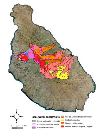 The Ancient Internal Eruptive Complex (CA) is present in the headwaters of the Ribeira de Boaventura and Ribeira de Picos basins and in the middle zone of the Ribeira do Charco basin following this stream to the mouth (Figure 2). This geological unit represents the substratum of the island, corresponding to the oldest formation that emerges due to the current level of erosion of the island, and constitutes the base of all other formations. It is characterized by the existence of a dense network of very altered lodes, being almost impossible to individualize in many of the spots.