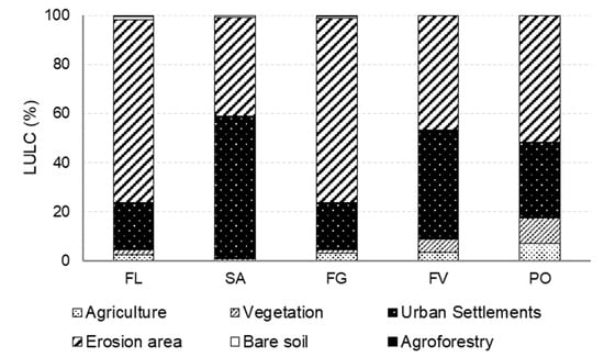 Similarly, the percentage of Land Use/Land Cover (LULC) in each drain basin (Figure 3) was estimated by Remote Sensing (DR) and by GIS techniques. First, the website https://earthexplorer.usgs.gov/(accessed on 29 April 2019) was used to obtain the satellite images. Then, the classification of images was conducted by analyzing the cartographic database (MDT) at the National Institute of Territory Management [57]. The classification of Landsat 5 images and the respective validation was performed using GIS modelling (ArcGIS 10.6) software, obtaining the LULC per pixel, referring to the previously defined occupation and land use classes using the maximum likelihood classification tool: Agriculture, vegetation, urban settlements, erosion area, bare soil, and agroforestry. It is noteworthy that the LULC estimation was conducted for 2018, which serves as a reference for the study period (2016–2020).